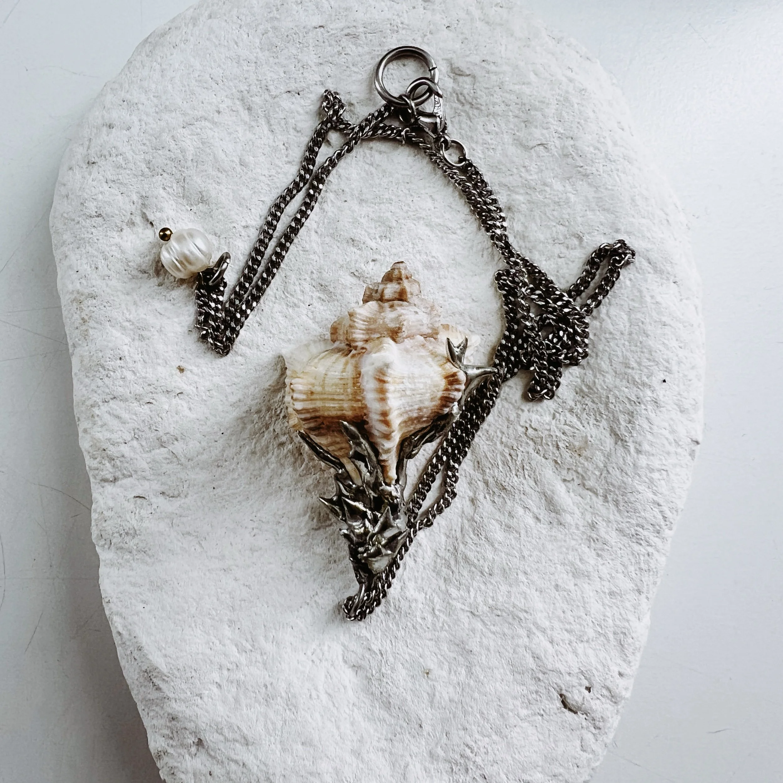 Coquillage naturel serti dans une soudure sans plomb, mêlant texture organique et métal brut.