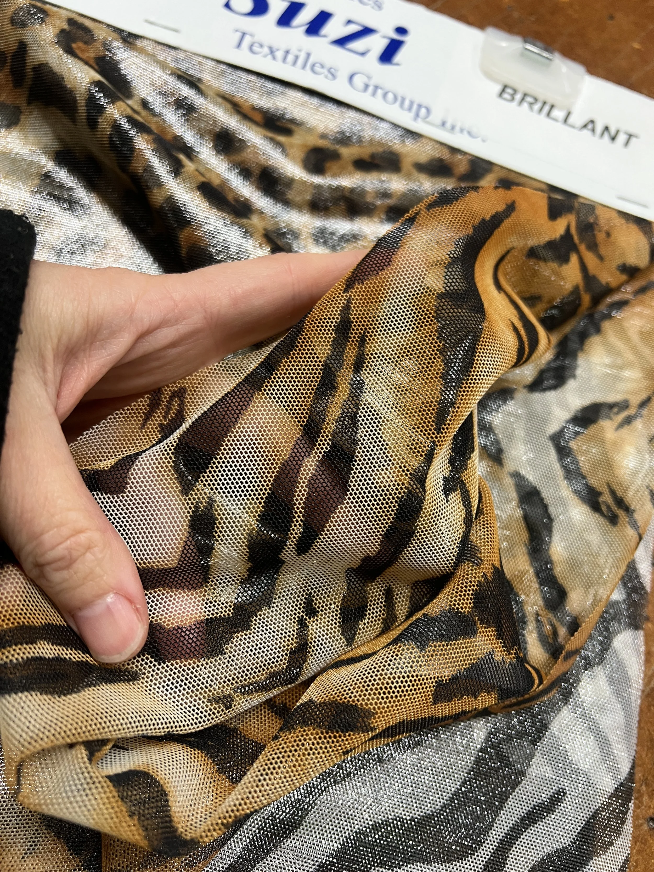 Après avoir consulté la cliente, on a décidé d’utiliser le tissu brillant, mais de retourner le léopard à l’envers pour qu’il soit mat. C’est un peu moins extensible comme ça, mais j’aime bien le défi que ça apporte au design.